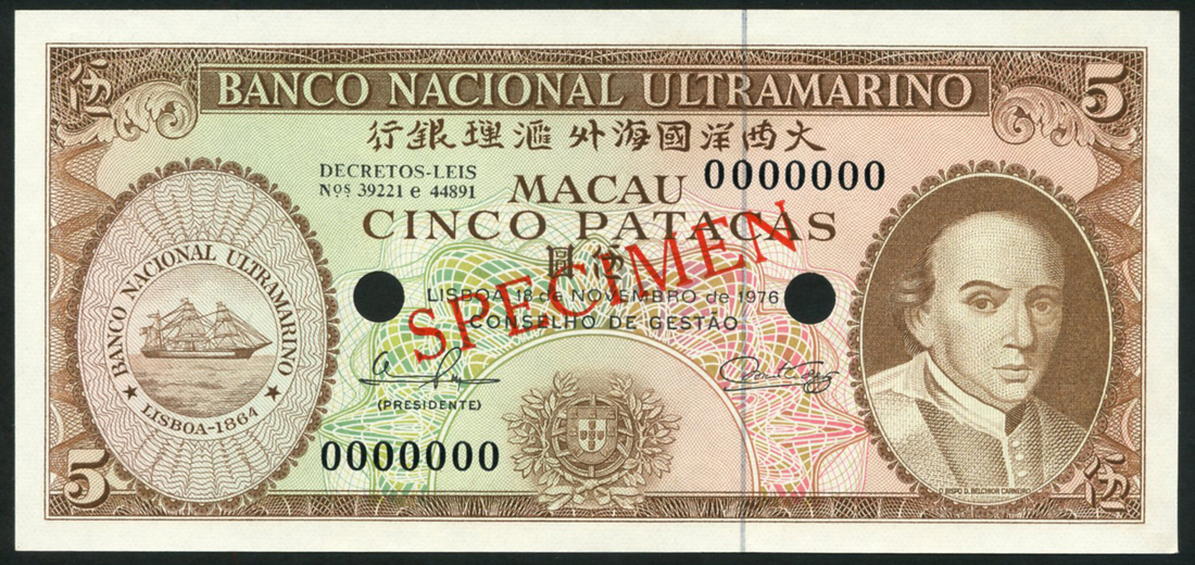(†) Banco Nacional Ultramarino, Macau, specimen 5 Patacas (3), 18 November 1976, serial number 0000000, brown and multicoloured, all Bishop D. Belchior at right, bank seal at left, reverse woman looking out at ships, value in guilloches at left and right, the first overprinted SPECIMEN diagonally in red on obverse and reverse, number 0081 in black in obverse top left corner, two punch holes, the second and third without SPECIMEN overprint, different signatures, one punch hole