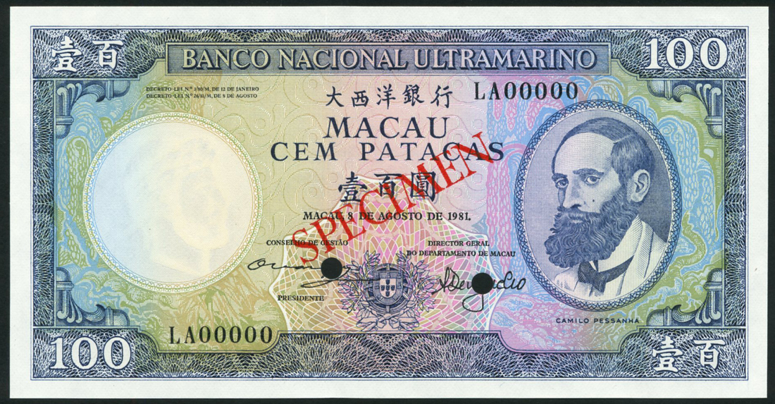 (†) Banco Nacional Ultramarino, Macau, specimen 50 Patacas, 1 September 1976, serial number 000000, greenish-grey, Luis de Camoes at right, reverse woman looking out at ships, overprinted ESPECIME diagonally in red on obverse and reverse; also specimen 100 Patacas, 8 August 1981, serial number LA 000000, blue and multicoloured, Camilo Pessanha at right, reverse 19th century harbour scene, overprinted SPECIMEN diagonally in red on obverse and reverse, both two punch holes