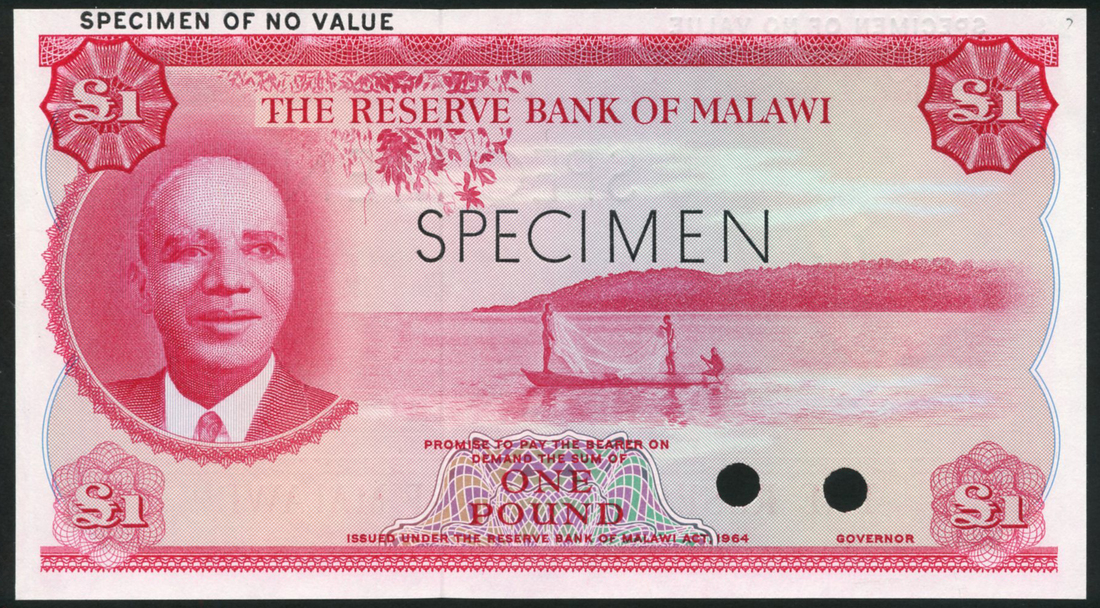 (x) Reserve Bank of Malawi, colour trial £1, ND (1964), no serial number, red and multicoloured, Doctor Hastings Banda at left, fishermen in canoe at right, reverse blue-grey, workers picking cotton, value at low centre and top left and right, perforated, black SPECIMEN overprint