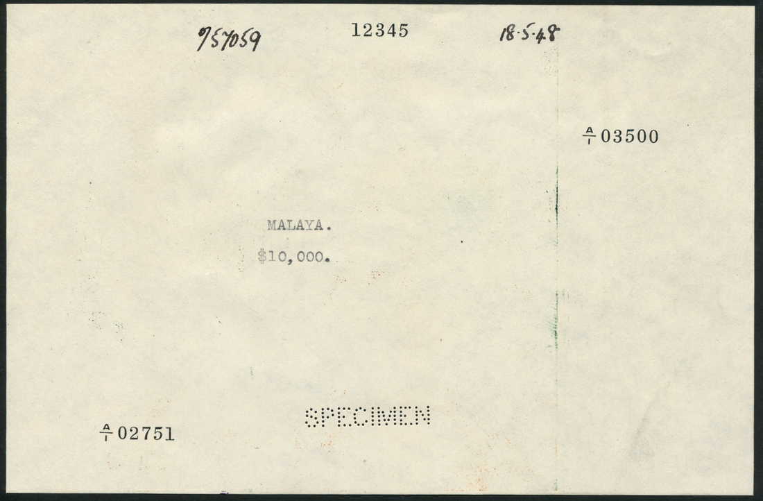 (†) Board of Commissioners of Currency, Malaya, archival records of the printings for $50, $1000, and $10000, c.1948, showing serial number runs, A/4 50001-A/5 50000, A/1 50001-A/1 51000 and A/1 02751-A/1 03500, all printed on proper banknote paper, the first with a watermark, all perforated SPECIMEN