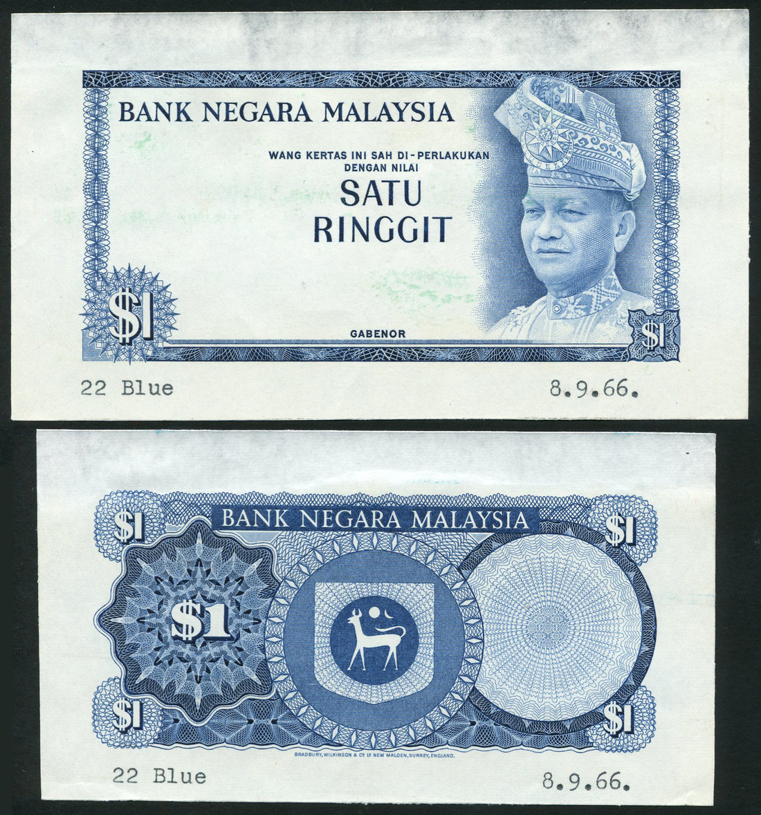 (†) Bank Negara Malaysia, a partial obverse and reverse die proof for a 1 ringgit, ND (ca 1966), first issue, blue and white, Tuanku Abdul Rahman at right, reverse blue and white, arms and value
