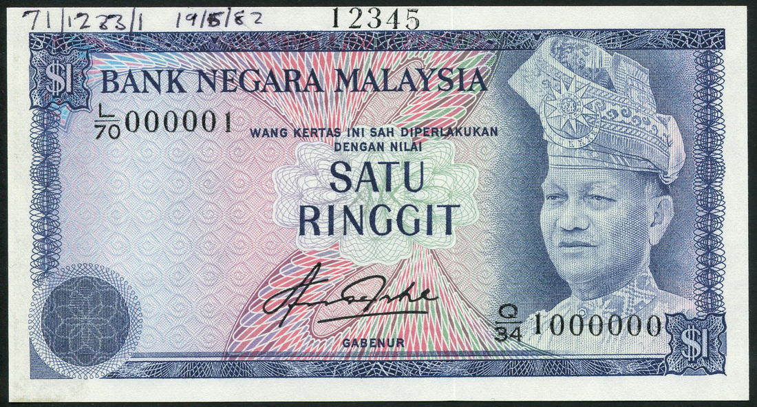(†) Bank Negara Malaysia, specimen 1 ringgit, ND (1981), prefix K/18, blue and multicoloured, Tuanku Abdul Rahman at right, value at centre and at each corner, Ismail Mohd.Ali signature, reverse blue, arms at centre, value at each corner, also two partial background printings, also 1 ringgit (2), ND (1981-1982), as previous but Abdul Aziz bin Taha signature, prefixes A/3 and L/70