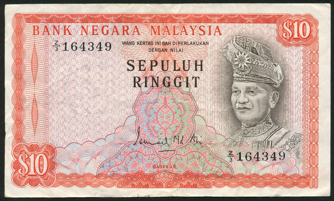Bank Negara Malaysia, $10, ND (1972), serial number Z/3 164349, black and orange on multicolour underprint, Tuanku Abdul Rahman in headdress at right