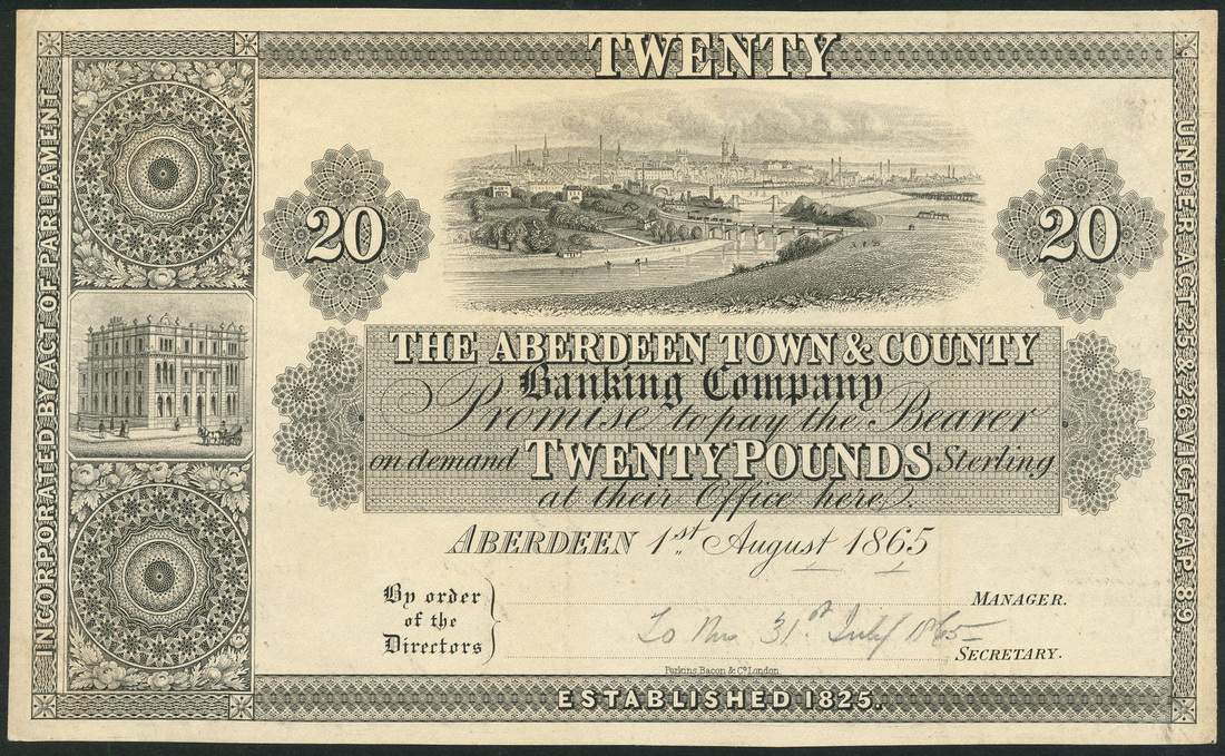 (x) Aberdeen Town & Country Banking Company, proof £20, 1 August 1865, uniface, black, view of Aberdeen top centre flanked by value in ornate tablets, bank title and value in panel at centre, bank head office in elaborate panel at left