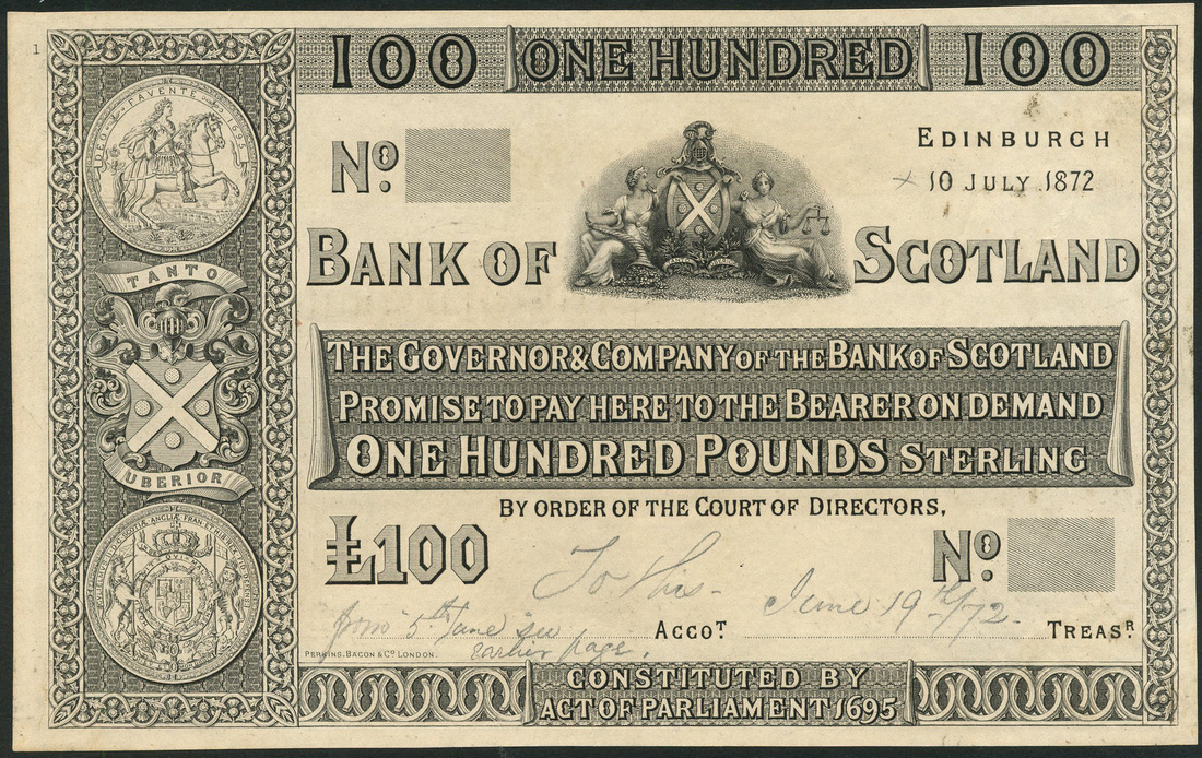 (x) Bank of Scotland, proof £100, 10 July 1872, uniface, black and white, allegorical maidens and arms top centre, Royal arms in ornate panel at left, bank title and value in black tablet at centre