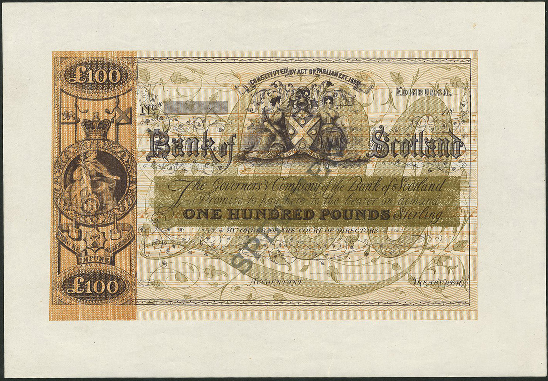 (x) Bank of Scotland, colour proof £100, 18--, pretty floral underprint, bank arms top centre, Royal coat of arms in orange panel at left, bank title and value in olive green tablet at centre