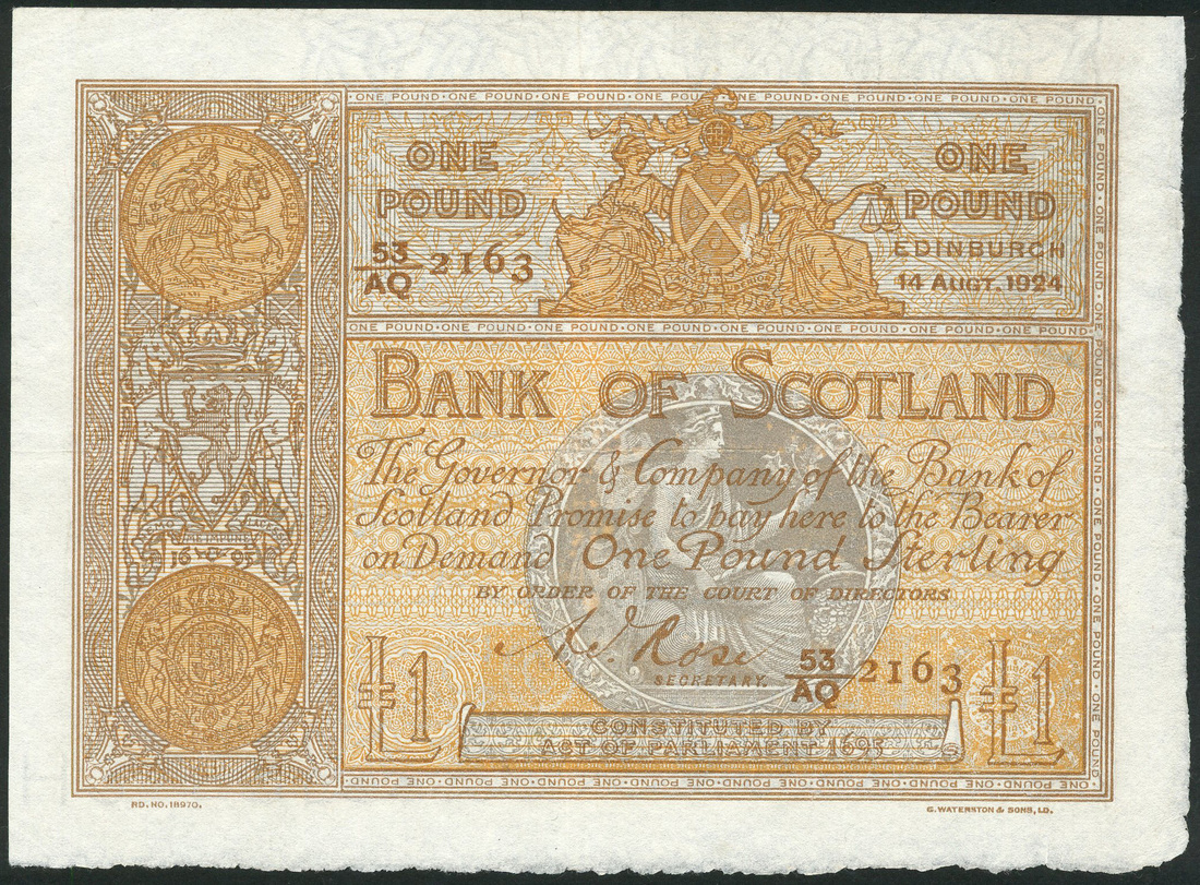 (x) Bank of Scotland, £1, 14 August 1924, serial number 53/AQ 2163, uniface, brown and light orange, bank arms top centre flanked by value, ornate panel at left, grey medallion low centre with bank title above, Rose signature