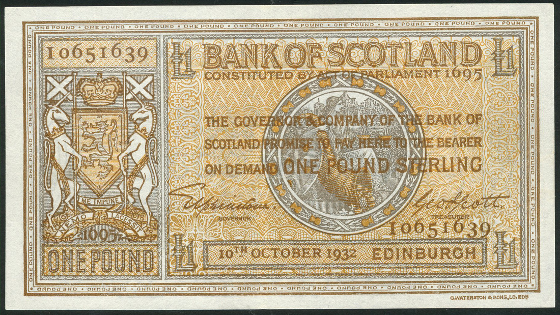 (x) Bank of Scotland, £1, 10 October 1932, serial number I0651639, brown on pale orange, Royal coat of arms in panel at left, bank title top centre, grey medallion at centre, Elphinstone/Scott signature, reverse, depiction of bank head office building