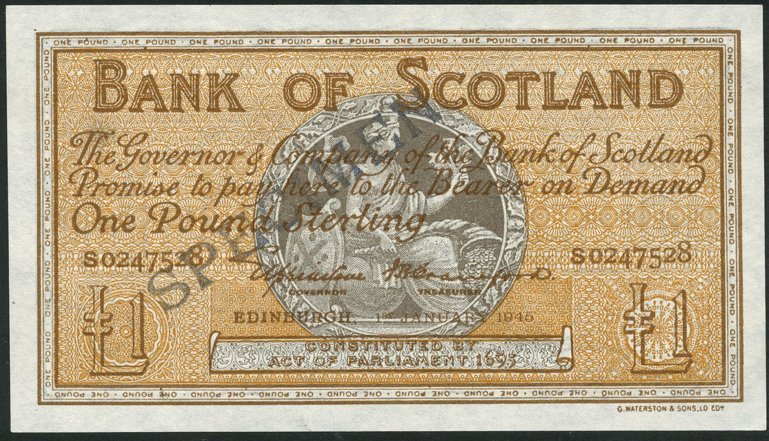 (x) Bank of Scotland, specimen £1, 1 January 1945, serial number S0247528, brown and light tan, bank title top centre, value low left, low right and centre left and in border around, grey medallion at centre, Elphinstone/Crawford signature, reverse, bank arms at centre with lined background