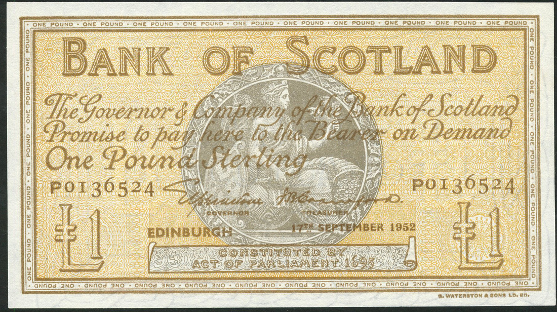 (x) Bank of Scotland, £1 (2), 17 September 1952, 30 November 1960, serial numbers P0136524, and B/A3470418, brown and light tan, bank title top centre, value low left, low right and centre left and in border around, medallion at centre (1952 grey, 1960 blue medallion), Elphinstone/Crawford and Bilsland/Watson signatures, reverses, bank arms at centre and ship at centre flanked by thistles respectively