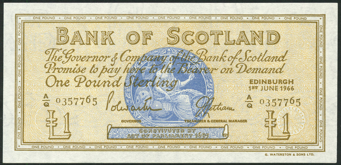 (x) Bank of Scotland, £1 (4), 1965, 1966, 1967 (2), serial numbers A/N0271011, A/Q0357765, A/X 0419802 and A/Z0821701, brown and light tan, bank title top centre, value low left, low right and centre left and in border around, blue medallion at centre, Bilsland/Watson (1), Polwarth/Letham (3) signature, reverse, ship at centre flanked by thistles on lined background