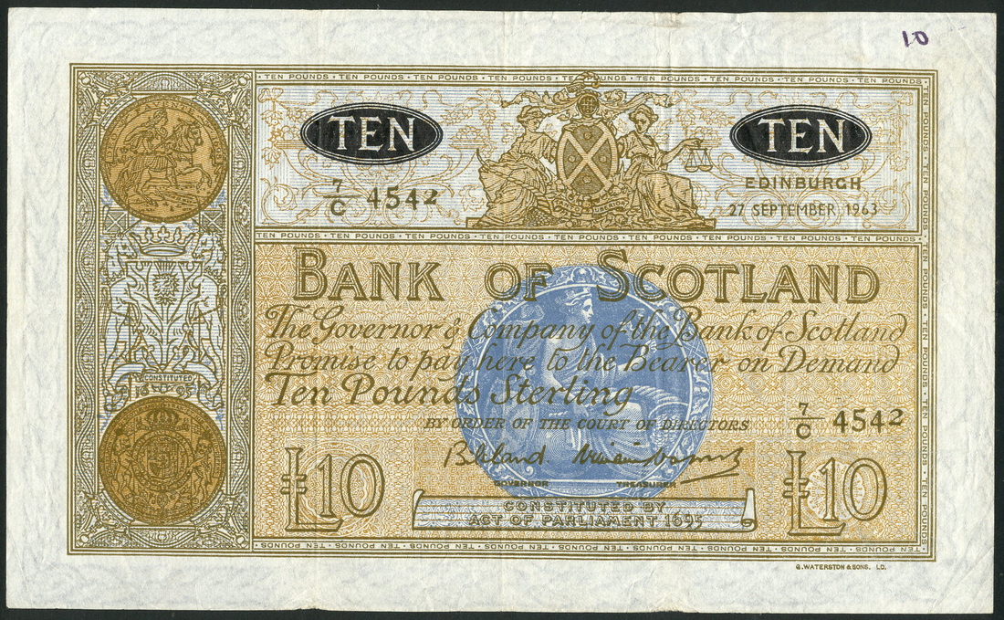 Bank of Scotland, £10, 27 September 1963, serial number 7/C 4542, brown and tan, bank arms top centre flanked by value in black panels, blue medallion at low centre with bank title above, ornate column with thistle motif at left, Bilsland and Watson signatures