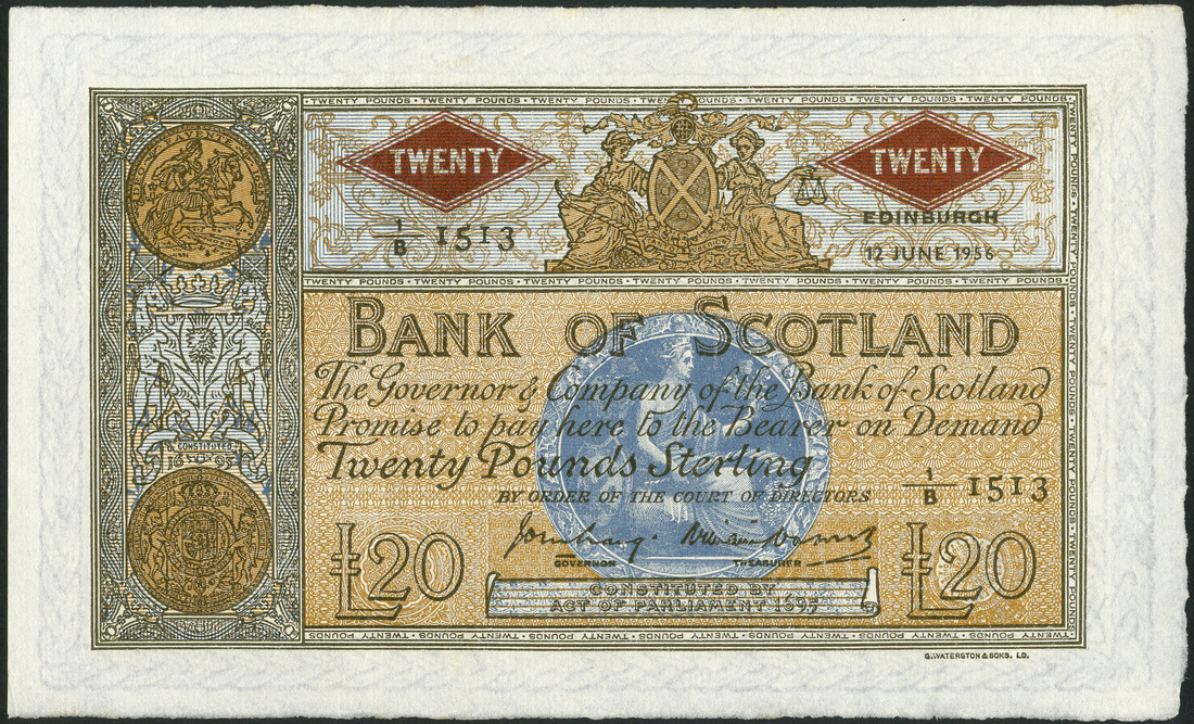 Bank of Scotland, £20, 12 June 1956, serial number 1/B 1513, brown, value in red panels top centre left and right, thistle motif in panel at left, bank title at centre with arms above, blue medallion at centre, Craig and Watson signatures