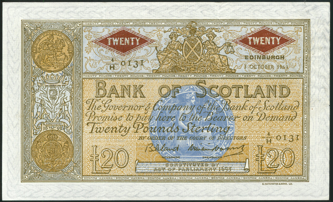 Bank of Scotland, £20 (4), 1963, serial numbers 2/G 4646, 4/G4171, 4/H0131 and 4/H 0133, uniface, yellowish brown, bank arms top centre flanked by value in red panels, ornate column with thistle motif at left, slate blue medallion at centre,