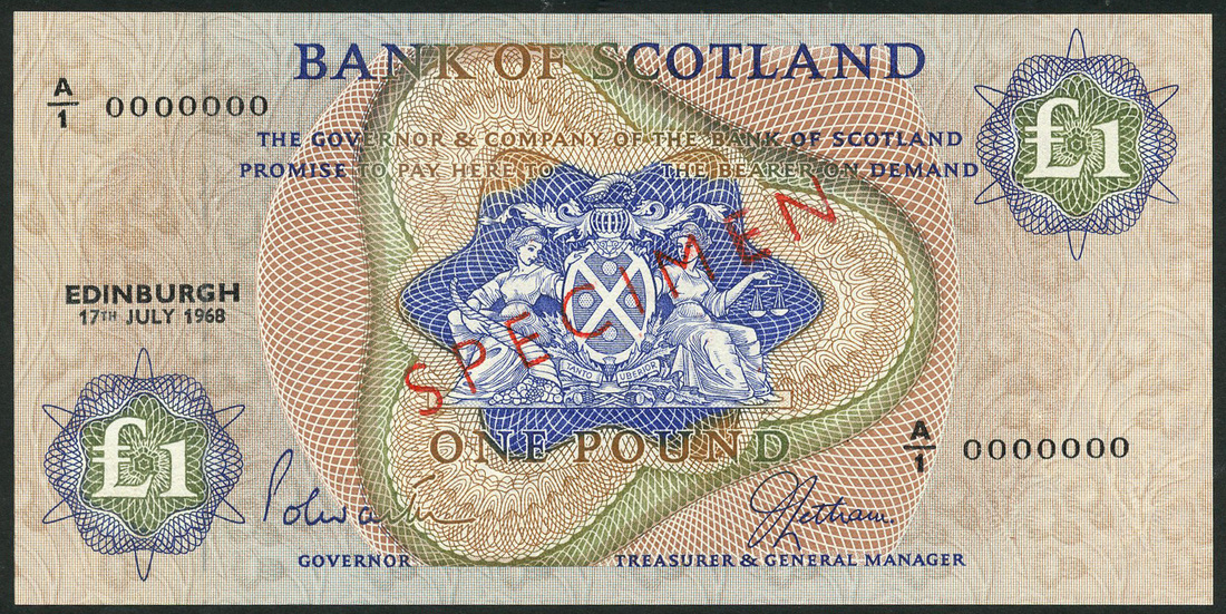 (x) Bank of Scotland, specimen £1, 17 July 1968, serial number A/1 0000000, brown on multicolour underprint, bank arms at centre value in ornate tablets low left and top right, Polwarth/Latham signature