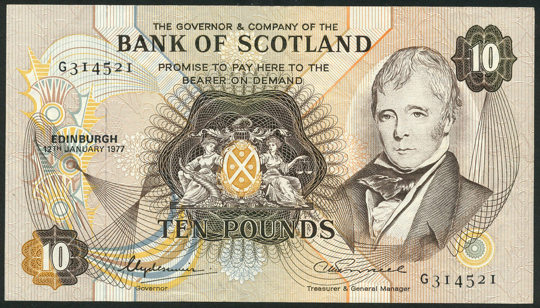 Bank of Scotland, £1 (3), 31 August 1971, serial number B/20 0808915, 1 November 1972, serial number C/2 0835608, and 19 August 1988, serial number E/3 0215356, £5, 2 September 1971, serial number H644947, £10, 12 January 1977, serial number G314521, blue and brown respectively, both feature the portrait of Sir Walter Scott at right, bank arms at centre, Polwarth/Walker signature on £5, Clydesmuir/Russell on £10