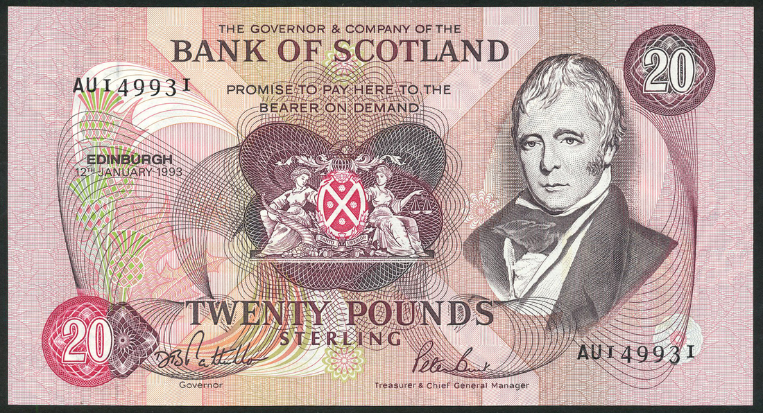 Bank of Scotland, £5, 1994, serial number FB999931, £10, 1994, serial number GG999931, £20, 1993, serial number AU149931, blue, brown and light purple, portrait Sir Walter Scott at right, bank arms at centre, value low left and top right and at centre