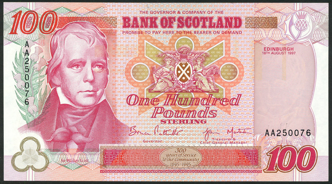 Bank of Scotland, £5, 1996, £10 (2), 1997 and 2001, £20 (2), 1996 and 2001, £100, 1997, blue, serial number AT050840, brown, serial numbers BV230560 and DU000341, purple, serial numbers BG247900 and DM000218 and red, serial number AA250076, all feature portrait Sir Walter Scott at left, value top left, low right and at centre, reverses, representations of oil and industry, distilling and brewing, education and research and leisure and tourism respectively