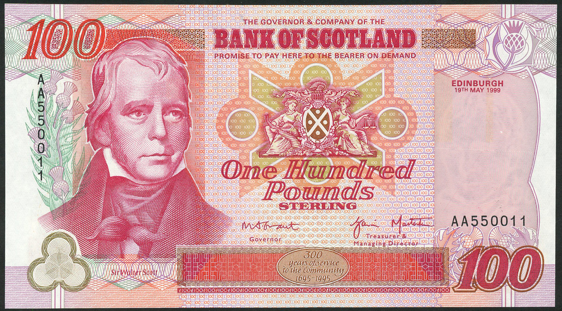 Bank of Scotland, £5, 1998, £10, 1998, £20, 1999, £50, 1999, £100, 1999, serial numbers BR999895, CG000128, CL158374, AA800075 and AA550011, blue, brown, purple, green and red respectively, portrait Sir Walter Scott at left, bank arms at centre, value top left, low right and at centre, reverses, oil and energy, distilling and brewing, education and research, arts and culture and leisure and tourism