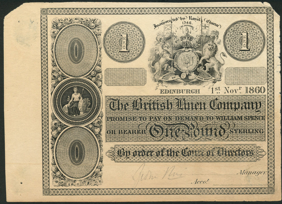(x) British Linen Company, proof £1, 1 November 1860, no serial number, uniface, black text, royal arms top centre flanked by value in circular frames, Britannia bank emblem in panel at left