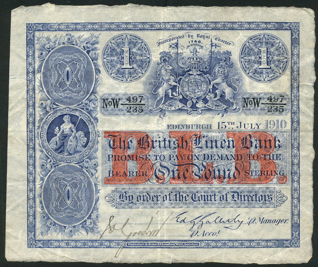 (x) British Linen Bank, £1, 15 July 1910, serial number W 497/235, uniface, blue, Royal arms top centre flanked by value in circular frames, bank emblem in ornate panel at left, red BLB at centre, Galletly and Goodwin signatures