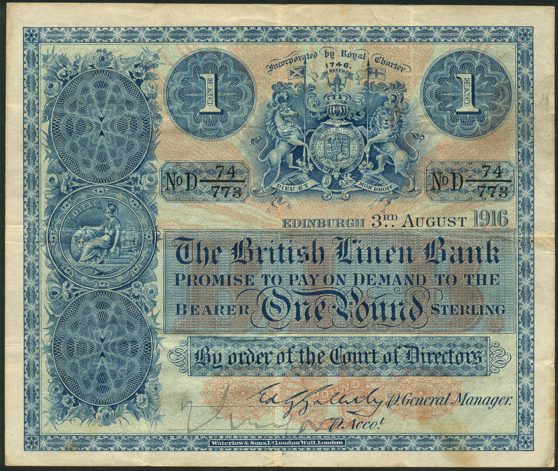 (x) British Linen Bank, £1, 3 August 1916, serial number D 74/773, blue on red sunburst underprint, Royal arms top centre flanked by value in circular panels, ornate panel at left with bank arms at centre, red BLB across centre, Galletly/proxy signature, reverse, blue, DITAT emblem at centre