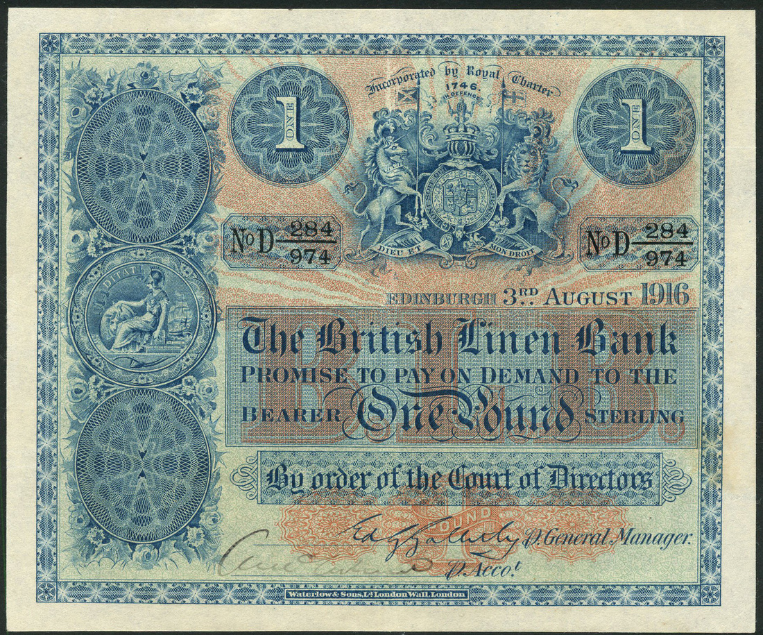 (x) British Linen Bank, £1, 3 August 1916, serial number D 284/974, blue on red sunburst underprint, Royal arms top centre flanked by value in circular panels, ornate panel at left with bank arms at centre, red BLB across centre, Galletly/proxy signature, reverse, blue, DITAT emblem at centre