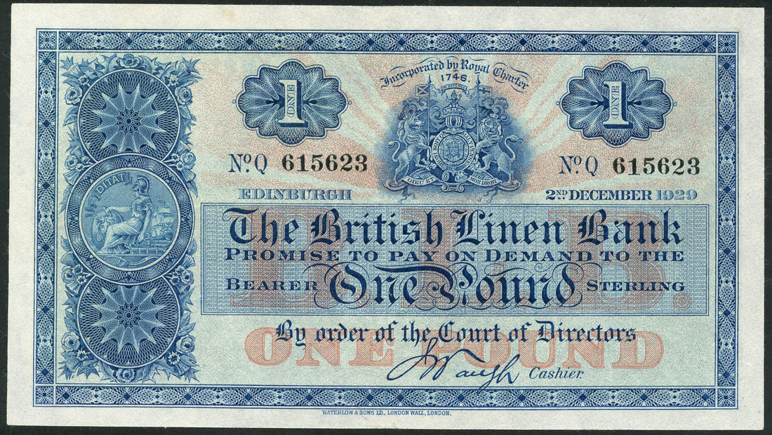 (x) British Linen Bank, £1, 2 December 1929, serial number Q 615623, blue on red sunburst underprint, Royal arms top centre flanked by value in circular panels, ornate panel at left with bank arms at centre, red BLB across centre, Waugh signature, reverse, blue, DITAT emblem at centre