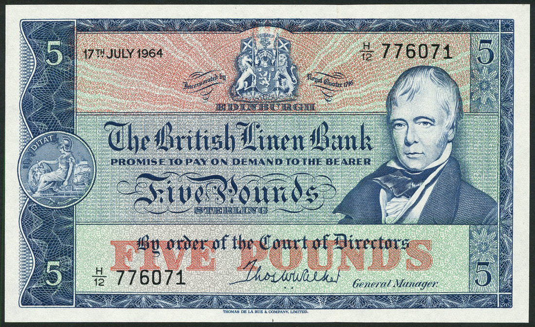 (x) British Linen Bank, £1 (4), 12 January 1955, serial number X/2 1204094, 31 March 1962, serial number U/3 377830, 13 June 1967, serial number G/4 402130 and 29 February 1968, serial number U/4 215578, also £5 (2), 17 July 1964, serial number H/12 776071, 23 April 1968, serial number L/12 598688, all blue with red sunburst underprint, Andersen signature (2), Walker signature (4)