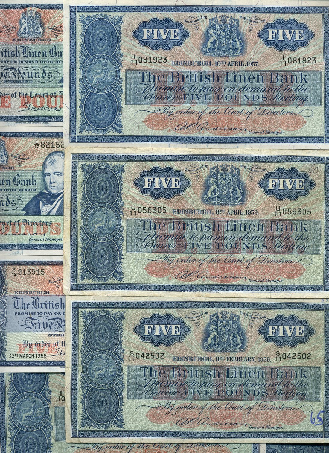 The British Linen Bank, £5 (7), 1953, 1957, 1959 (2), 1962, 1964, 1968, blue on light green and red sunburst underprint, bank arms top centre, bank title at centre, ornate panel at left, value top centre left and right