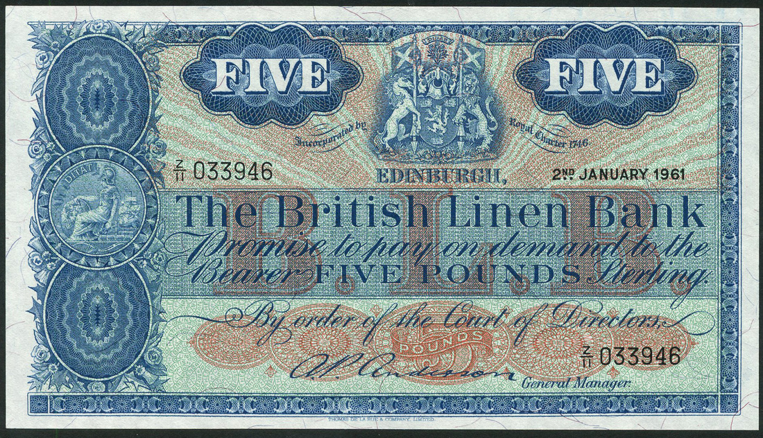 (x) British Linen Bank, £5, 2 January 1961, serial number Z/11 033946, blue on red sunburst underprint, Royal arms top centre flanked by value in circular panels, ornate panel at left with bank arms at centre, red BLB across centre, Anderson signature, reverse, blue, DITAT emblem at centre