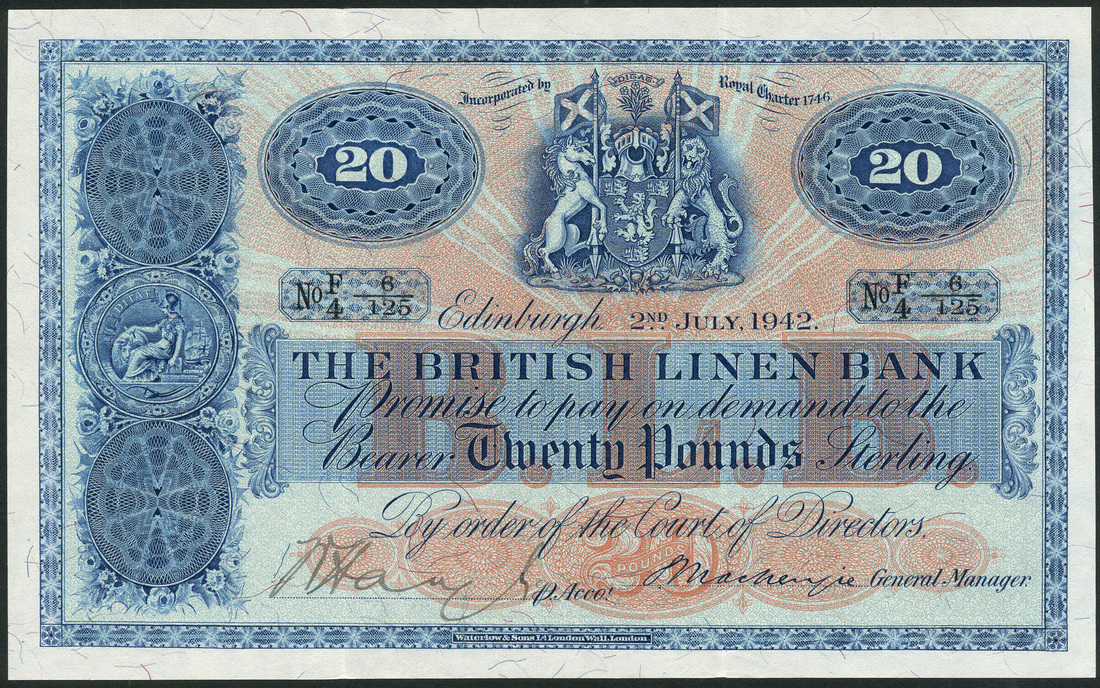 (x) British Linen Bank, £20, 2 July 1942, serial number F/4 6/125, blue on red sunburst underprint, Royal arms top centre flanked by value in circular panels, ornate panel at left with bank arms at centre, red BLB across centre, proxy/Mackenzie signature, reverse, blue, DITAT emblem at centre
