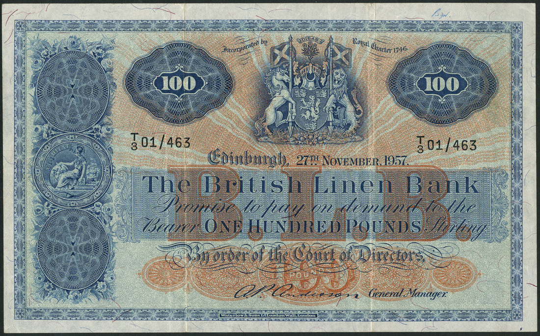 British Linen Bank, £100, 27 November 1957, serial number T3 01/463, blue and red, arms top centre flanked by value in ornate tablets, bank title at centre, value in red tablet low centre, elaborate column at left, Anderson signature, reverse, blue panel with DITAT emblem at centre