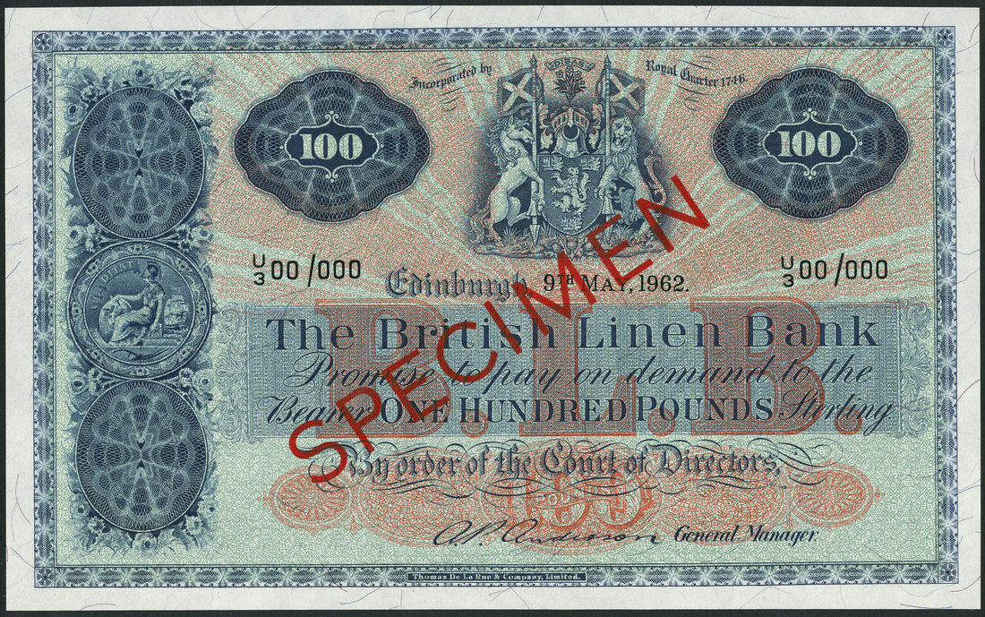 (x) British Linen Bank, specimen £100, 9 May 1962, serial number U3 00/000, blue on red sunburst underprint, Royal arms top centre flanked by value in circular panels, ornate panel at left with bank arms at centre, red BLB across centre, Anderson signature, reverse, blue, DITAT emblem at centre