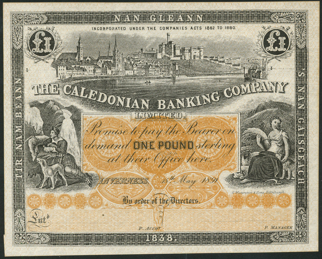 (x) Caledonian Banking Company, unissued £1, 15 May 1891, uniface, grey and orange, view of Inverness top centre flanked by value in ornate tablets, kilted man with dogs, mountain streams in background at low left and seated maiden with sheep to her left and dog at right, bank title at centre