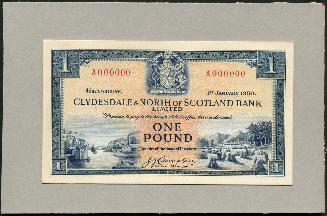 (†) Clydesdale & North of Scotland Bank Limited, an obverse composite essay on board for a £1, Glasgow, 1 January 1950, serial number A000000, signature J. J. Campbell, blue on yellow and orange underprint, arms at top centre, ships and docks at lower left, sheaves in a field at lower right