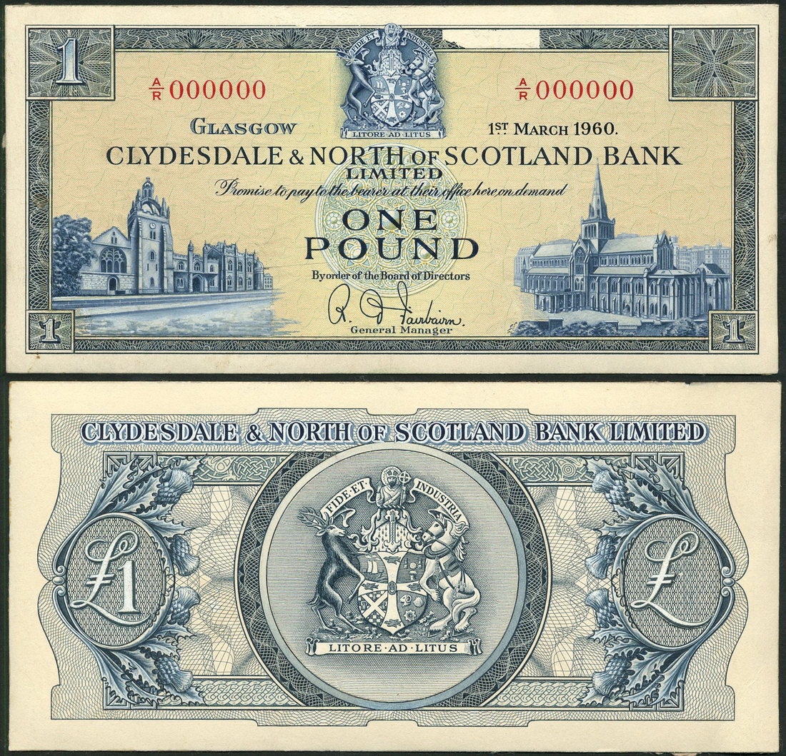 (†) Clydesdale & North of Scotland Bank Limited, an obverse and reverse composite essay on board for a £1, Glasgow, 1 March 1960, serial number A/R 000000, signature R. D. Fairbairn, blue and black on yellow underprint, arms at top centre, King's College, Aberdeen at low left, Glasgow Cathedral at low right, reverse arms at centre, value in oval guilloches at left and right