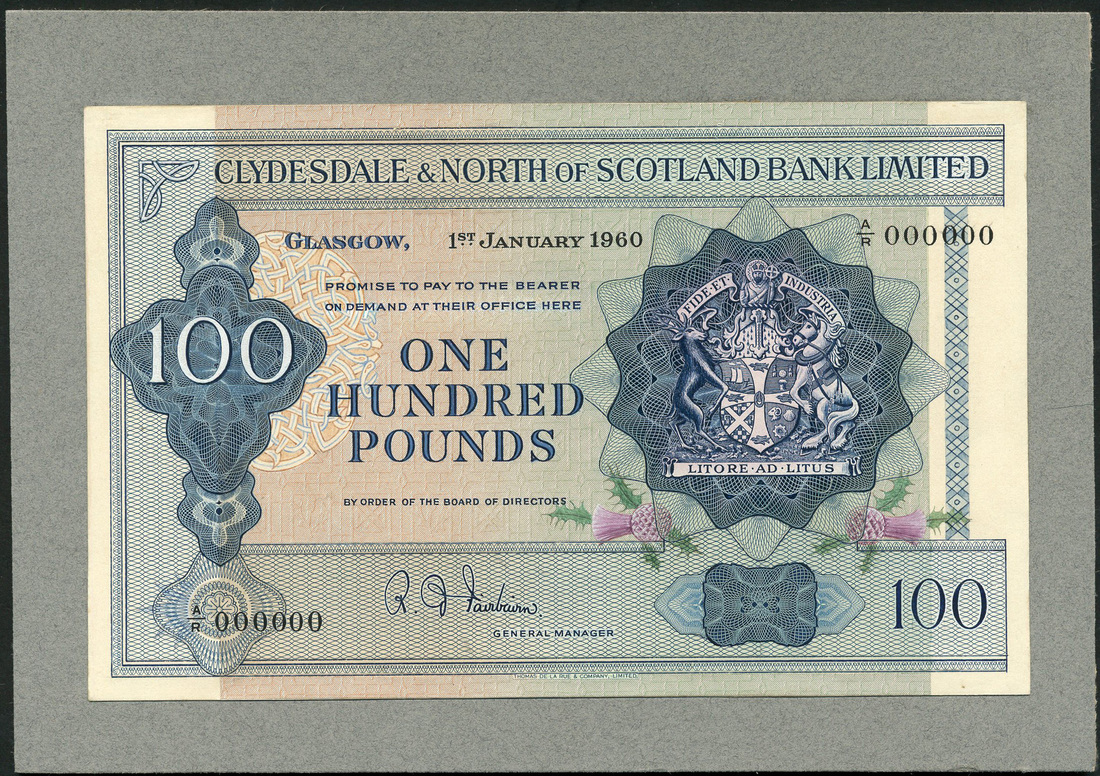 (†) Clydesdale & North of Scotland Bank Limited, an obverse composite essay on board for a £100, Glasgow, 1 January 1960, serial number A/R 000000, signature R. D. Fairbairn, blue on pale green and pale brown underprint, arms at right, value in guilloche at left