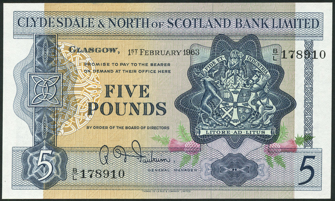 (x) Clydesdale & North of Scotland Bank Limited, £1, 1 February 1963, serial number B/G 601431, £5, 1 February 1963, serial number B/L178910, blue on multicolour and green on multicolour respectively, bank arms at right, ornate panel at left with value, bank title along top, Fairbairn signature, reverse, on £1, ship in dockyard and on £5, King's College, Aberdeen