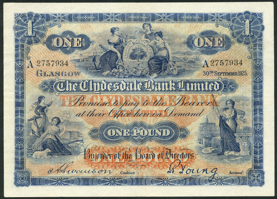 (x) Clydesdale Bank Limited, £1, 30 September 1925, serial number A2757934, blue and red, allegorical maidens at low left, right and top centre, bank title in red at centre, ornate border, Swanson/Young signature, reverse, Glasgow coat of arms flanked by value in ornate blue guilloche
