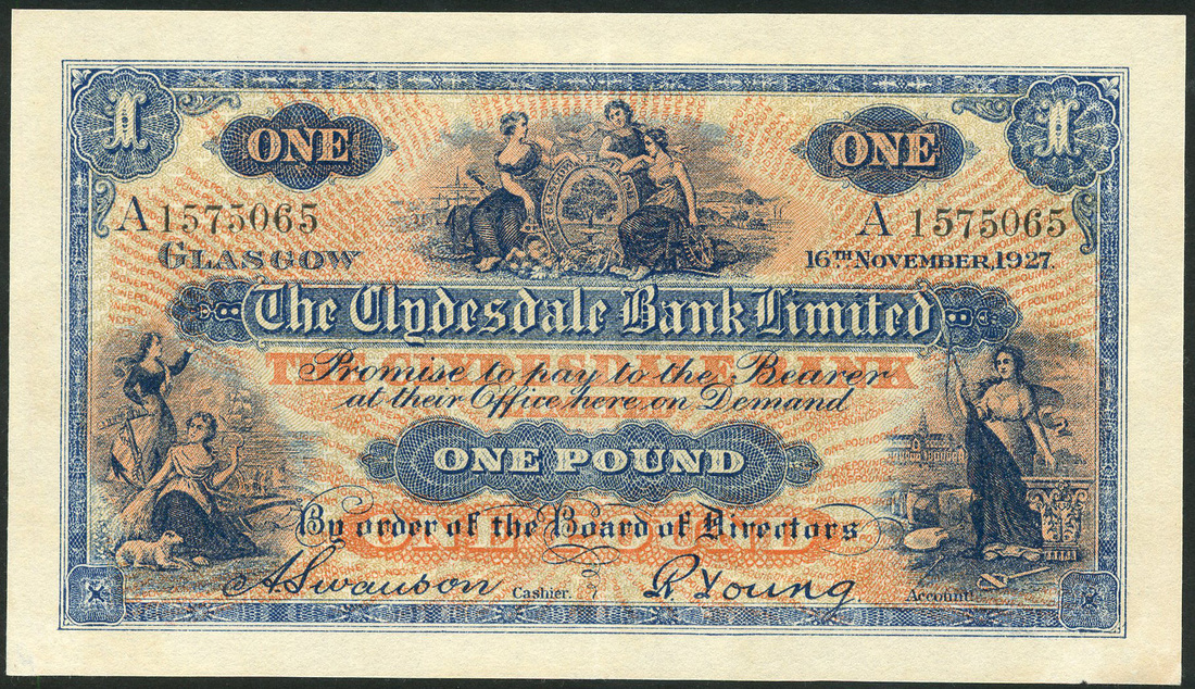 (x) Clydesdale Bank Limited, £1, 16 November 1927, serial number A1575065, blue and red, allegorical maidens top centre and low left and right, bank title in panel at centre, Swanson/Young signature, reverse, arms of Glasgow flanked by value in ornate guilloche pattern