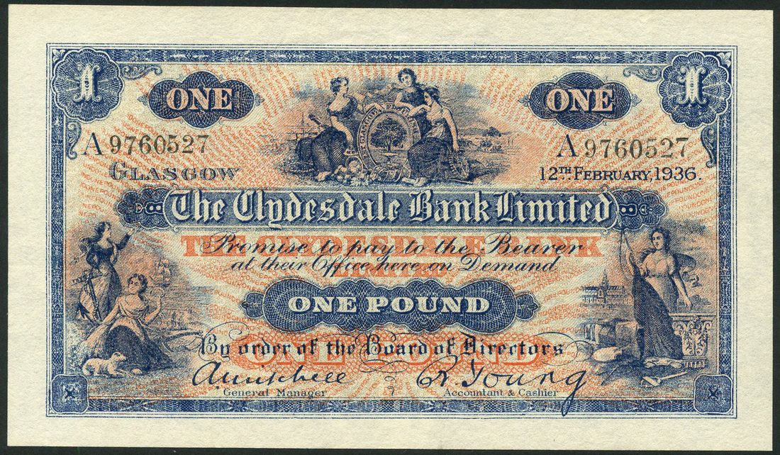 (x) Clydesdale Bank Limited, £1, 12 February 1936, serial number A9760527, blue and red, allegorical maidens top centre and low left and right, bank title in panel at centre, Mitchell/Young signature, reverse, arms of Glasgow flanked by value in ornate guilloche pattern
