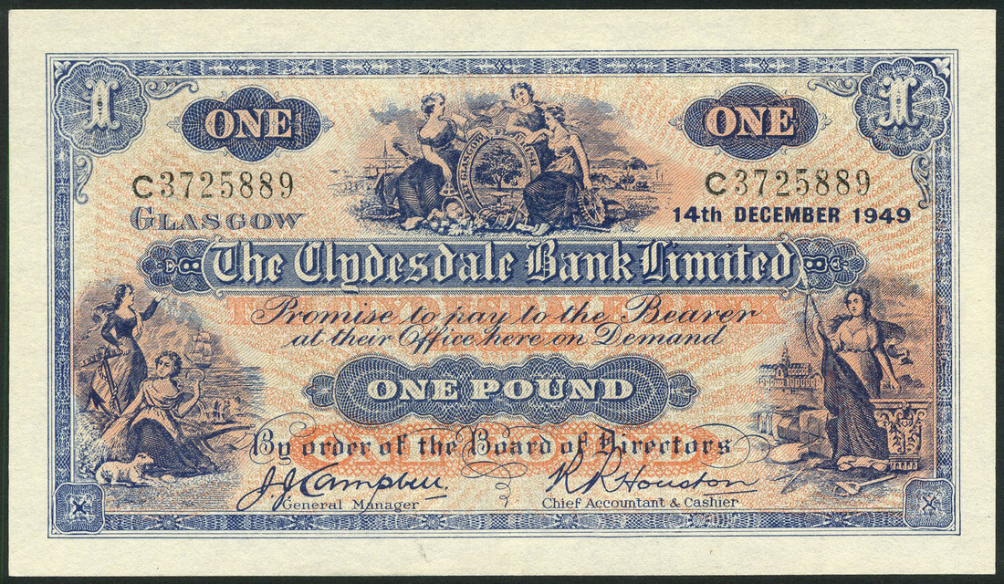 (x) Clydesdale Bank Limited, £1, 14 December 1949, serial number C3725889, blue and orange, allegorical maidens low left, right and top centre, bank title at centre, ornate border around, Campbell/Houston signature, reverse, arms of Glasgow and value in ornate guilloche