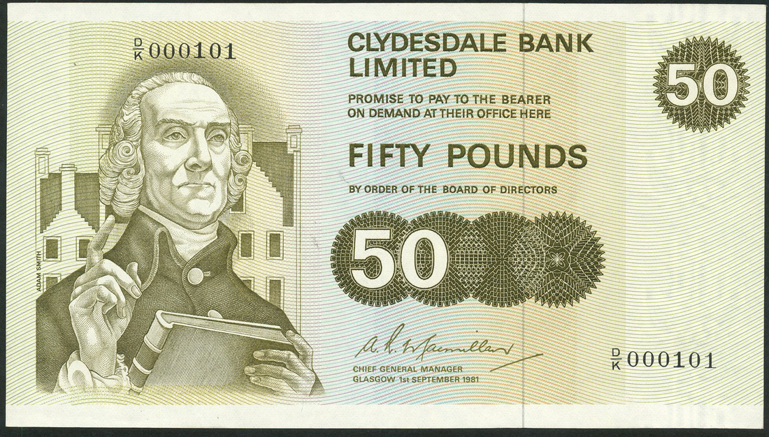 (x) Clydesdale Bank Limited, £50, 1 September 1981, serial number DK000101, olive green on pale blue, portrait Adam Smith at left, value in ornate tablet top right and at centre, bank title top centre right, MacMillan signature, reverse, group of old industrial and agricultural implements, ships in background