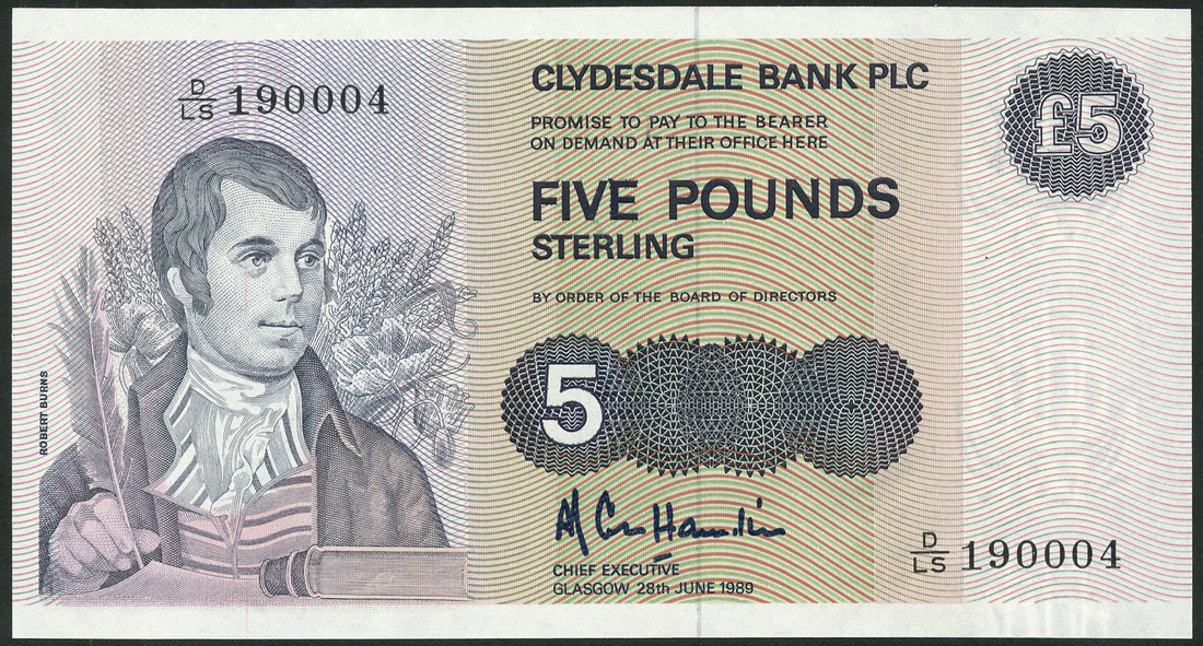 (x) Clydesdale Bank Limited/Plc, £1 (3), 1972, 1983, 1988, serial numbers D/K055009, D/CL496815, D/DW033075, green, portrait Robert the Bruce at left, £5 (3), 1982, 1989, 1990, serial numbers D/FC178703, D/LS190004, E/AX069379, portrait Robert Burns at left, all feature bank title top centre right, value in ornate tablet at centre and top right, MacMillan signature (1), Hamilton signature (5)