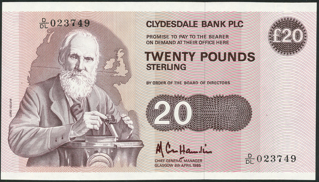 (x) Clydesdale Bank Plc, £10 and £20, both dated 8 April 1985, serial numbers D/LV058815 and D/DL023749, brown and purple respectively, £10, portrait David Livingstone at left, £20, portrait Lord Kelvin at left, value centre right and top right, Hamilton signature