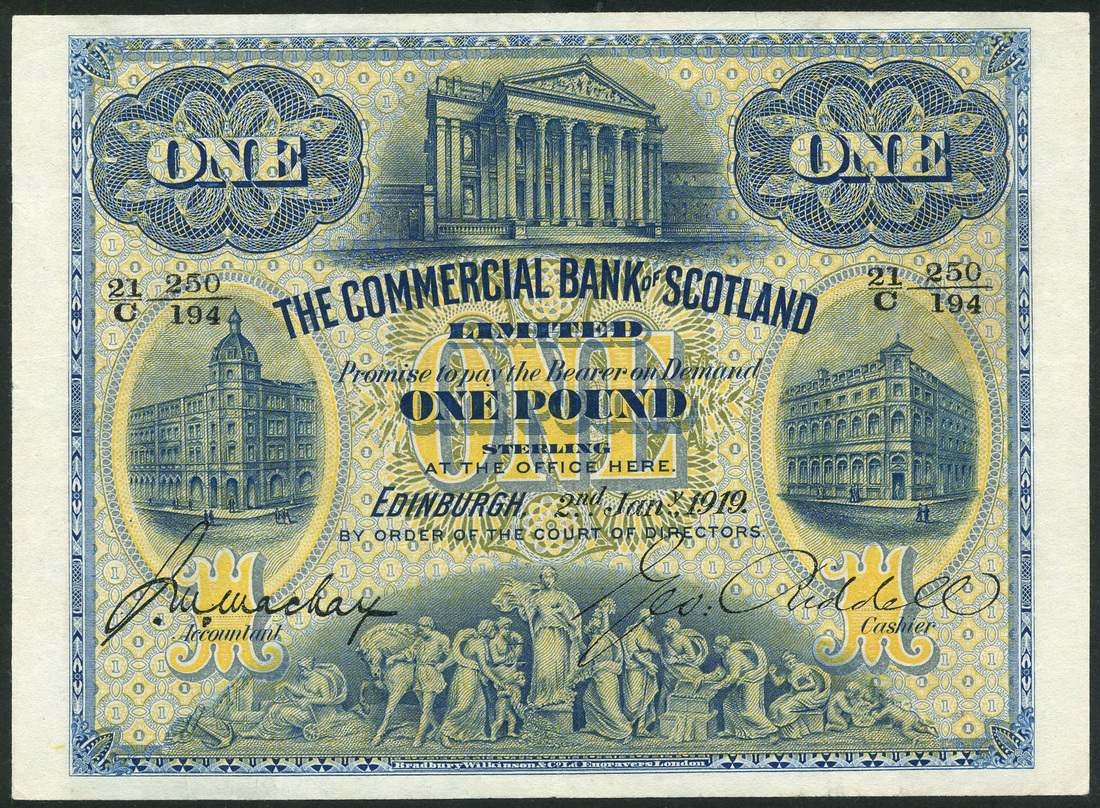 (x) Commercial Bank of Scotland Limited, £1, 2 January 1919, black serial number 21/C 250/194, blue on yellow and pale blue underprint, depictions of the bank's head offices in Edinburgh, Glasgow and London, frieze along low margin, Mackay/Riddell signature, reverse, bank emblem in ornate guilloche pattern