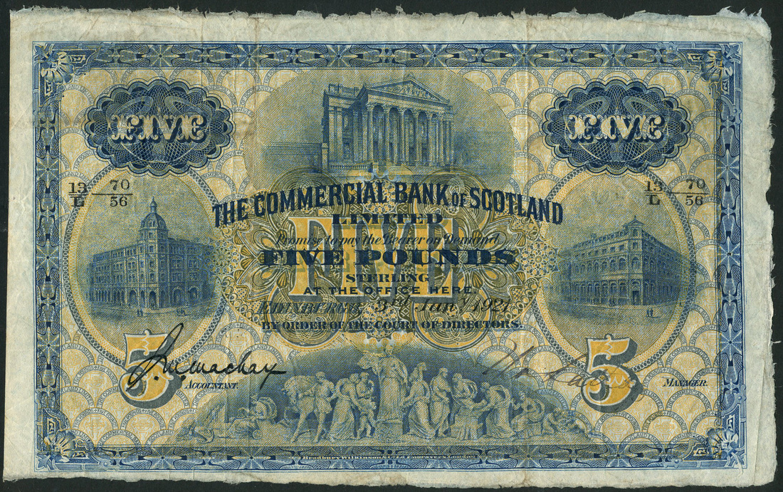 (x) Commercial Bank of Scotland Limited, £5, 3 January 1921, serial number 13/L 70/56, blue on yellow and pale blue underprint, depictions of the bank's head offices in Edinburgh, Glasgow and London, frieze along low margin, Mackay/proxy signature, reverse, bank emblem in ornate guilloche pattern
