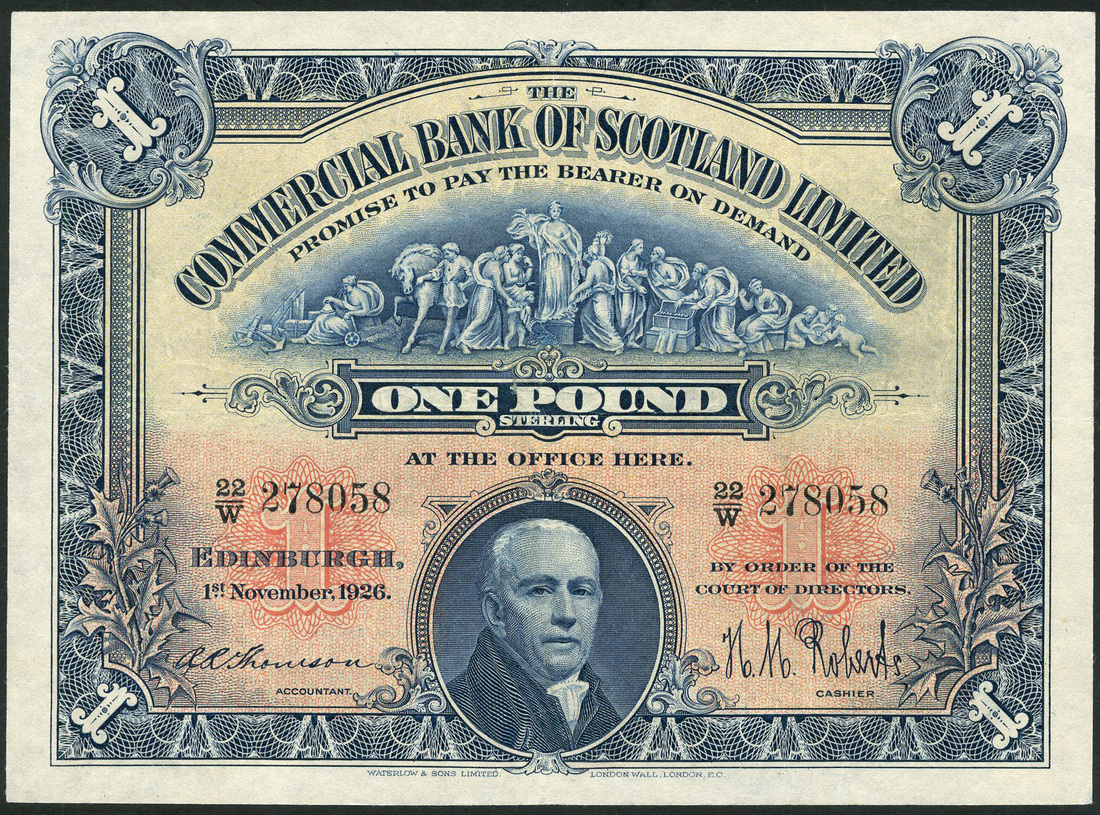 (x) Commercial Bank of Scotland Limited, £1, 1 November 1926, serial number 22/W 278058, dark blue on pale pink and yellow underprint, portrait Lord Pitcairn at low centre, bank title top centre, ornate border with value in each corner, Thomson/Roberts signature, reverse, illustration of bank building within guilloche pattern