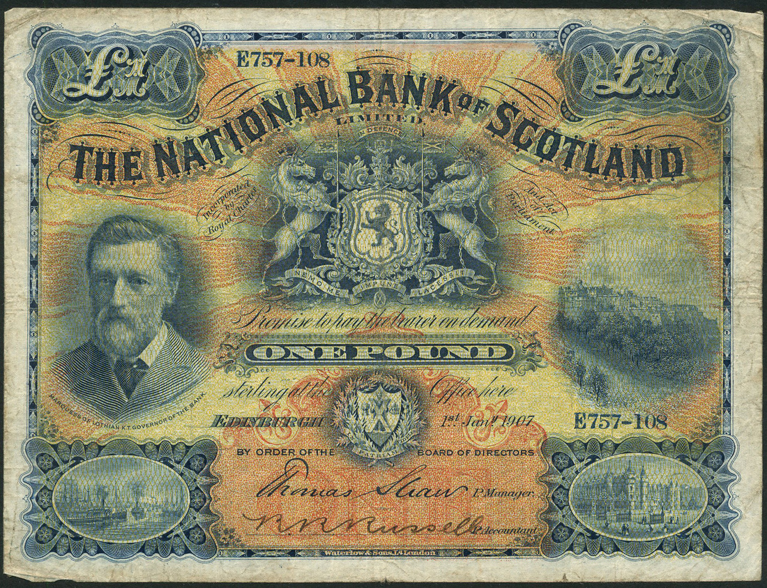 (x) National Bank of Scotland Limited, £1, 1 January 1907, serial number E757-108, blue on red and yellow sunburst underprint, portrait Marquess of Lothian at left, royal coat of arms at centre, Edinburgh Castle at right, Shaw/Russell signature, reverse, aerial view of Edinburgh in circular panel within ornate pattern, value in each corner